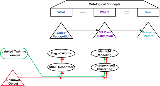 In this paper, we aim at designing a unified architecture for autonomous manipulation of unknown objects, which is capable of answering and addressing the constraints of all the following questions: “What is the object?”, “Where is it?" and “How to grasp it?". Towards this end, we address the recognition problem from a shape-based perspective, whilst obtaining accurate detection decisions via a Bag-of-Visual Words classification scheme. Moreover, the 6 DoF pose estimation module is based on the intuitive idea that even different objects when observed under the same viewpoints should share identical poses that can be projected onto highly discriminative subspaces. Grasping points are found through an ontology-based knowledge acquisition where recognized objects inherit the grasping points assigned to the respective class. Our ontologies include: a) object-class related data, b) pose-manifolds assigned to each instance of the object-class conceptual model and c) information about the grasping points of every trained instance. The main idea underlying the proposed method is illustrated in the following figure.